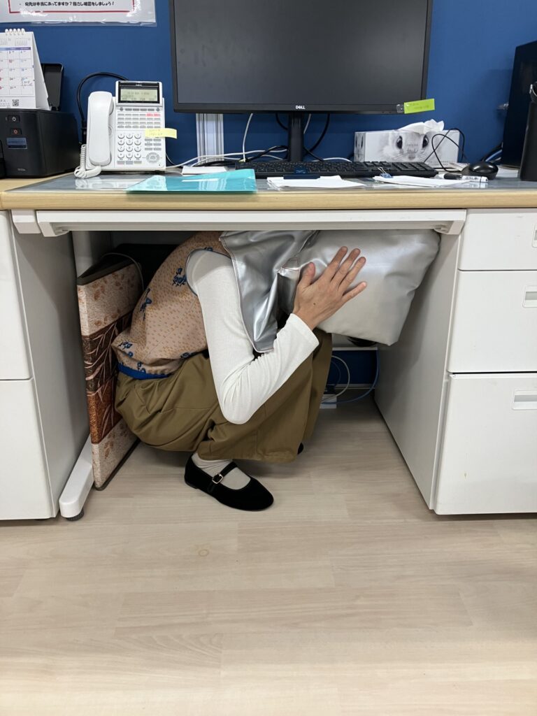 震度7強の地震が発生したという想定で、まず全員で机の下に!