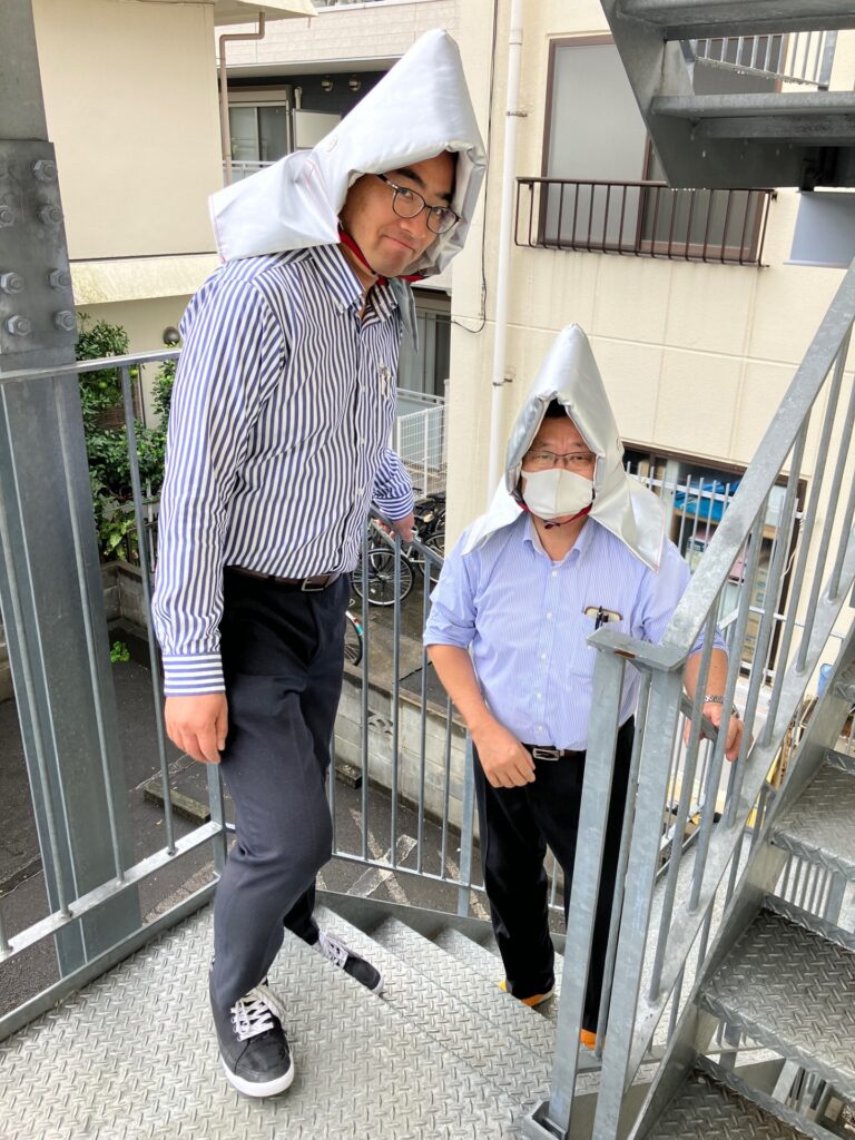 当日はあいにくの雨で避難場所である近くの公園までは行けませんでしたが、外や建物の損害状況の確認、ネットやラジオでニュースの確認、社内にいない人の安否確認等・・・それぞれの役割分担のシミュレーションも行いました。